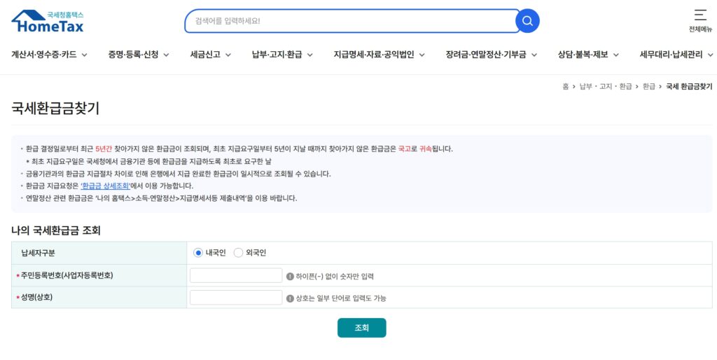 - 결과 확인: ‘조회하기’ 버튼을 누르면 현재 내가 받을 수 있는 환급금 유무와 상세 내역을 바로 확인할 수 있습니다.